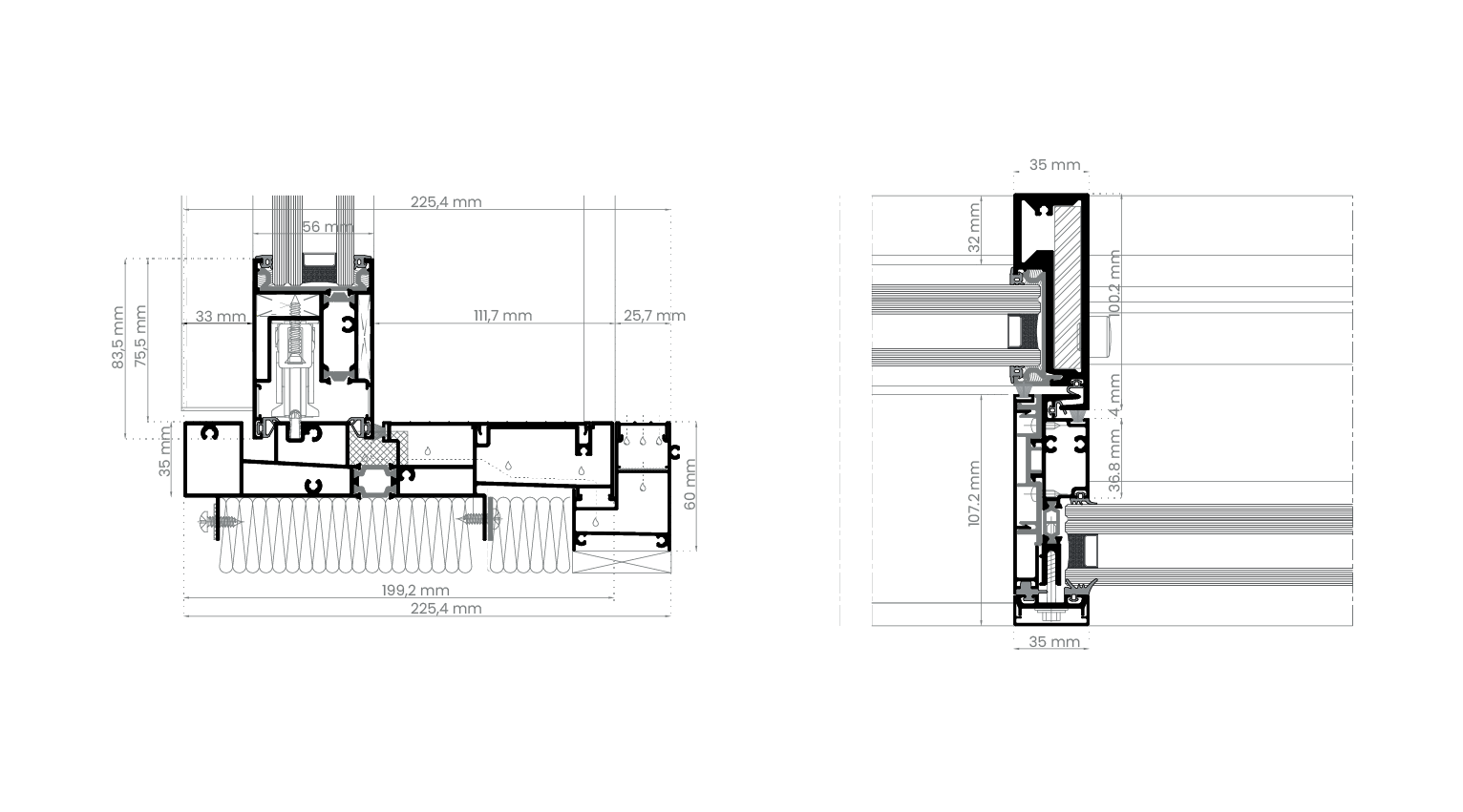This system combines curtain wall and lift-and-slide joinery, offering functionality and aesthetics in a single structure. Thanks to its single-rail frame design, the sashes operate internally, while the 35 mm visible surfaces provide an elegant and minimal appearance.