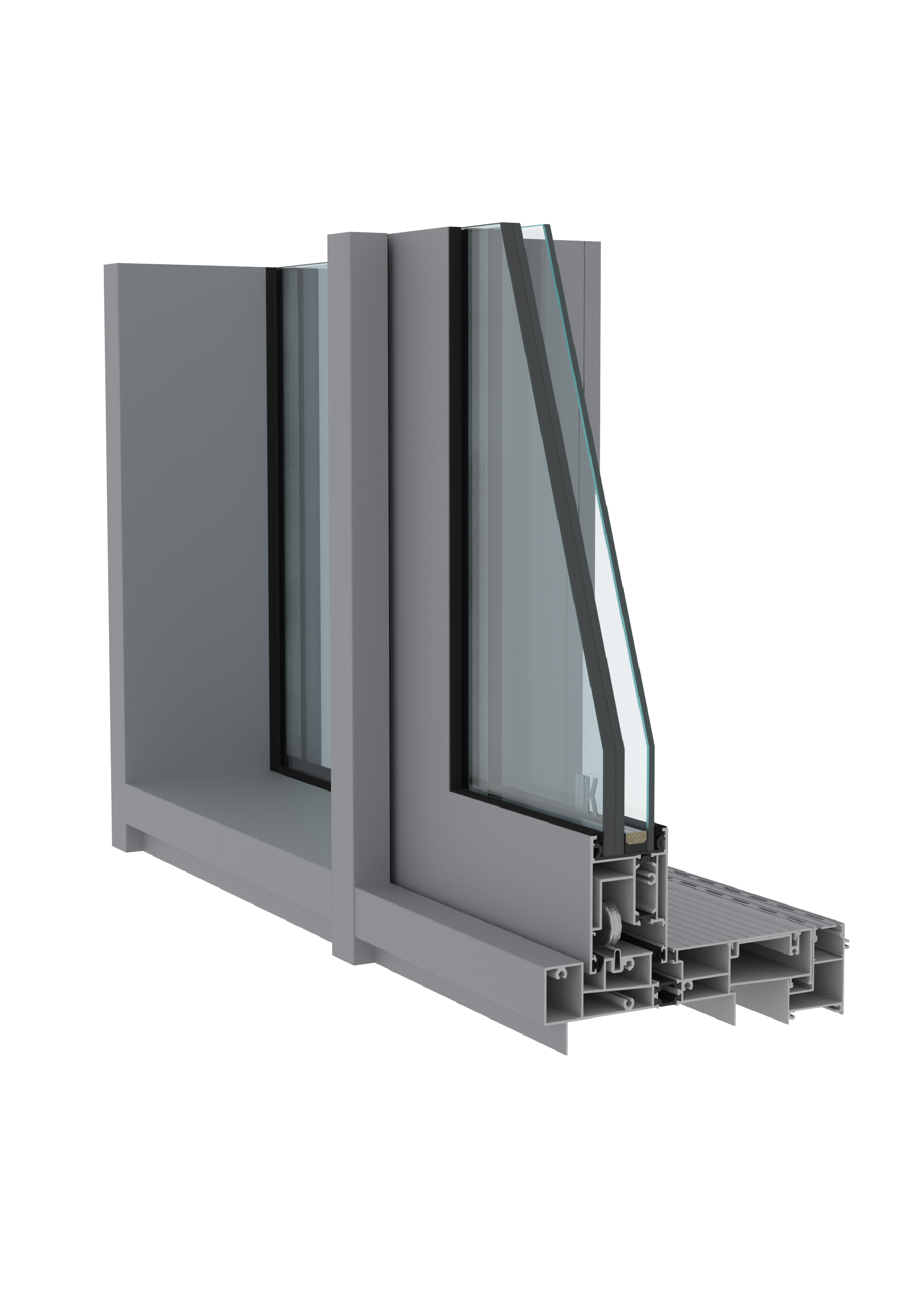 The floor-recessed frame structure and concealed drainage profiles enable efficient water discharge. Polyamide and anti-bi-metal thermal barriers provide high thermal performance and durability, creating superior resistance against significant temperature differences between indoor and outdoor environments. The robust sash design ensures protection against strong winds and allows for spanning large openings of up to 3.2 m x 3.5 m. The system supports lift-and-slide sashes weighing between 300–400 kg.